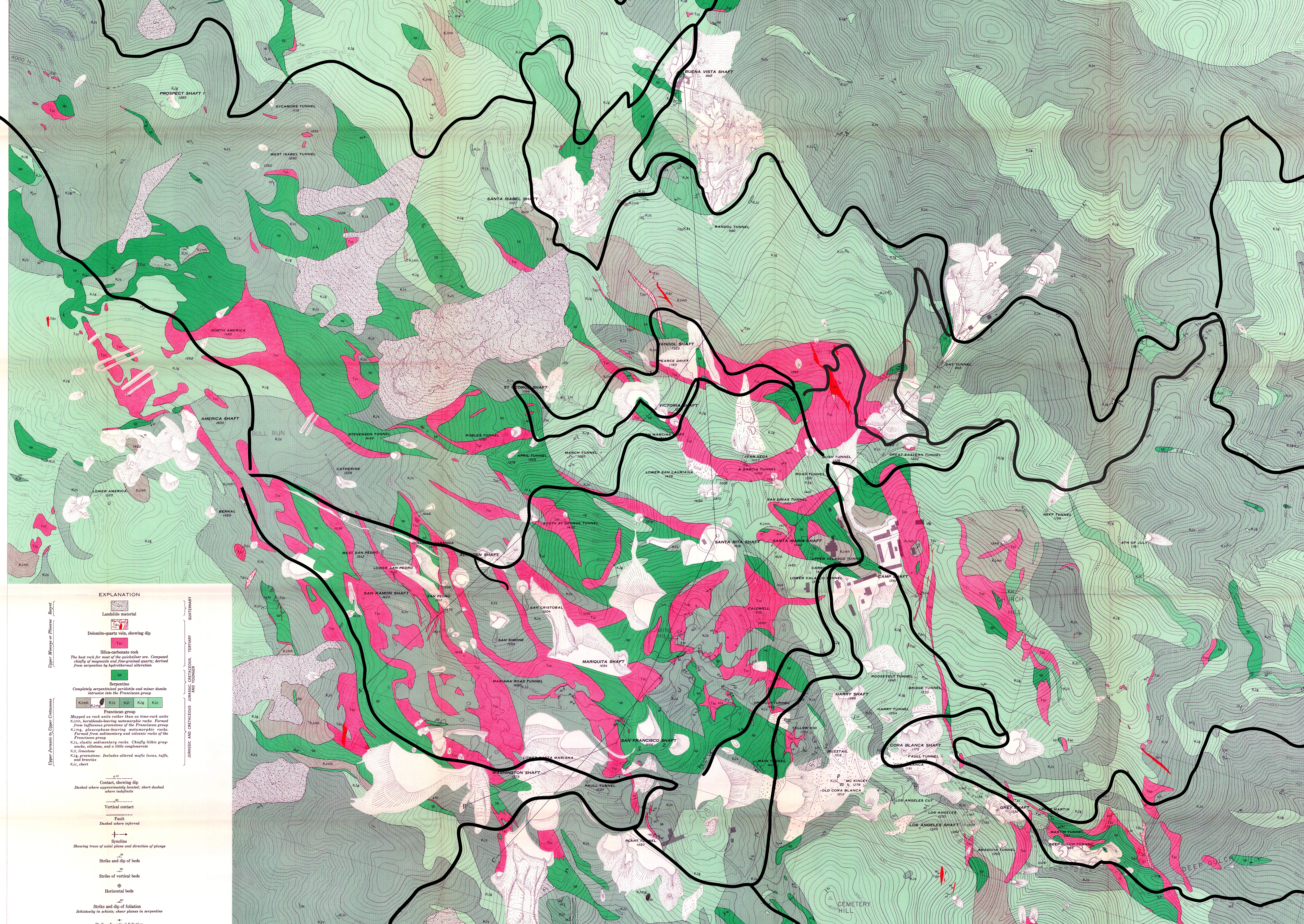 Into the Mountain: The scale of tunneling at New Almaden was staggering. Beginning with the original Main Tunnel โ a passage ten feet high driven directly into Mine Hill in 1850 โ successive managers sent crews deeper and deeper into the rock. By the peak years, workers had bored over 100 miles of tunnels and shafts into the Cinnabar Hills. The deepest point reached 2,300 feet below the summit of Mine Hill, and one shaft was eventually driven to 2,450 feet โ the deepest quicksilver shaft in the world. Miners labored ten-hour shifts by candlelight, often more than a thousand feet underground. The Randol Shaft, sunk in 1870, became the workhorse of the operation: in the two decades after its completion, crews were pulling 300 tons of ore per day from its depths. By 1896 the mine was producing $10 million worth of quicksilver annually.